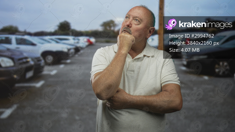 Man with hand on chin beside parked cars in a street parking lot, looking upward and pensive; thoughtful reflection.
