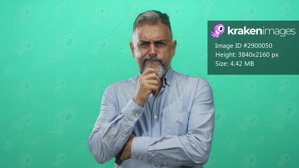 Man with hand on chin and crossed arms in mint green studio wearing a light blue shirt and gray beard visible, head tilted slightly in thinking pose; thoughtful reflection. - Kraken Images