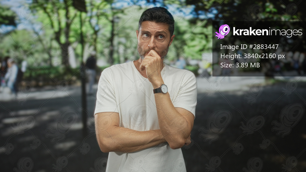 Man with hand on chin and crossed arms on street wearing white tshirt and wristwatch; quiet contemplation.