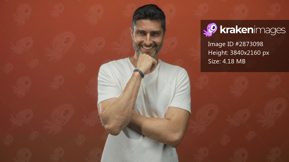Man with hand on chin and crossed arms smiling, braided bracelet visible, wearing white tee in studio with orange backdrop; thoughtful.