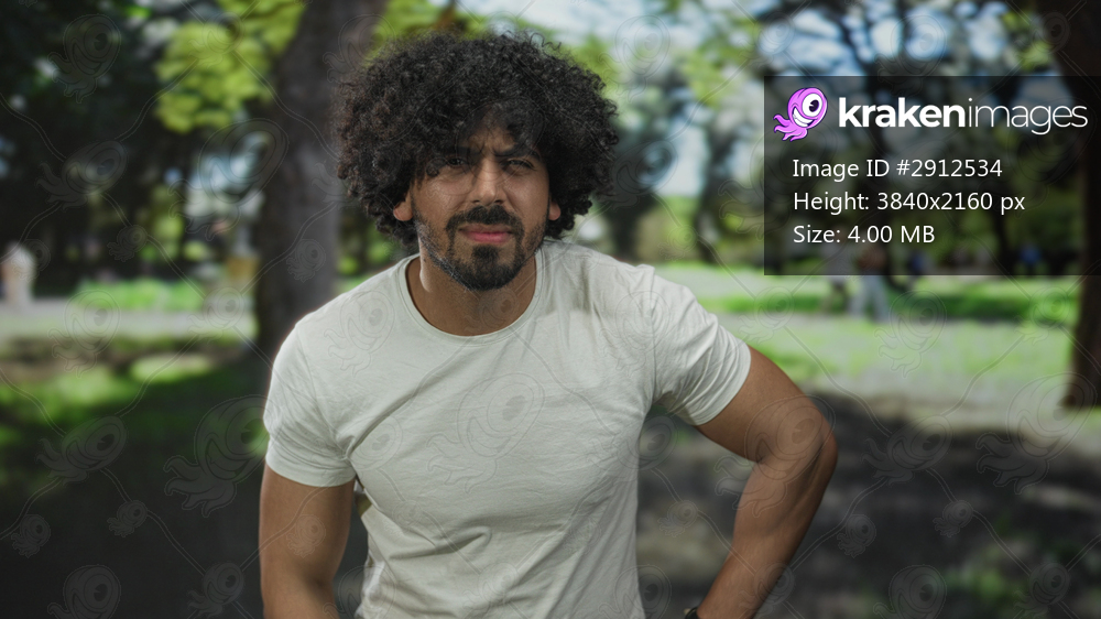 Man with hand on chin and curly hair in park among trees and grass wearing white tshirt and beard, leaning slightly forward; thoughtful pondering.