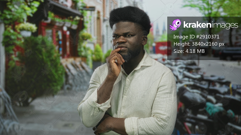Man with hand on chin and folded arm on street beside parked bicycles and cafe storefronts; thoughtful reflection.