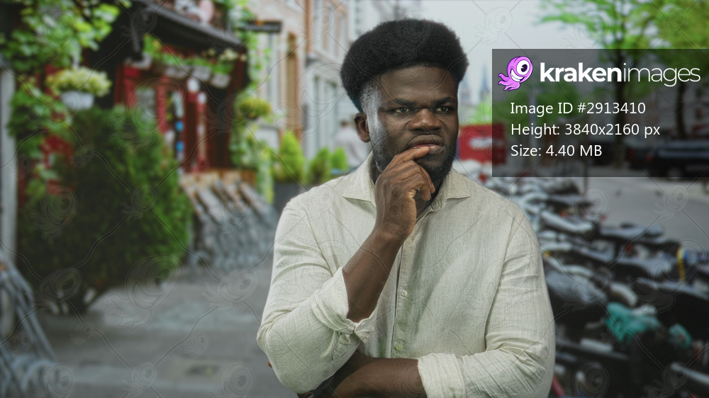 Man with hand on chin and folded arm on street beside parked bicycles and cafe storefronts; thoughtful reflection.
