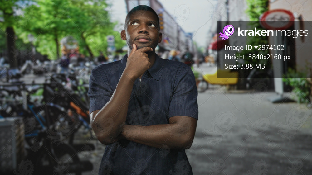 Man with hand on chin and folded arms beside parked bicycles and a bike sign on a busy street; contemplation.
