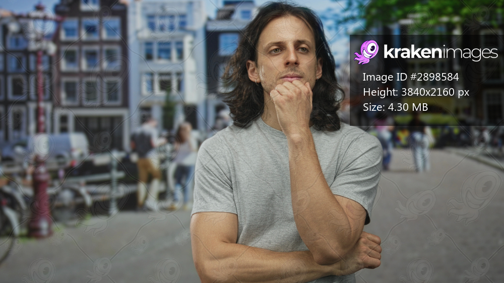 Man with hand on chin and folded arms on a city street, long hair in a grey t shirt; thoughtful reflection.