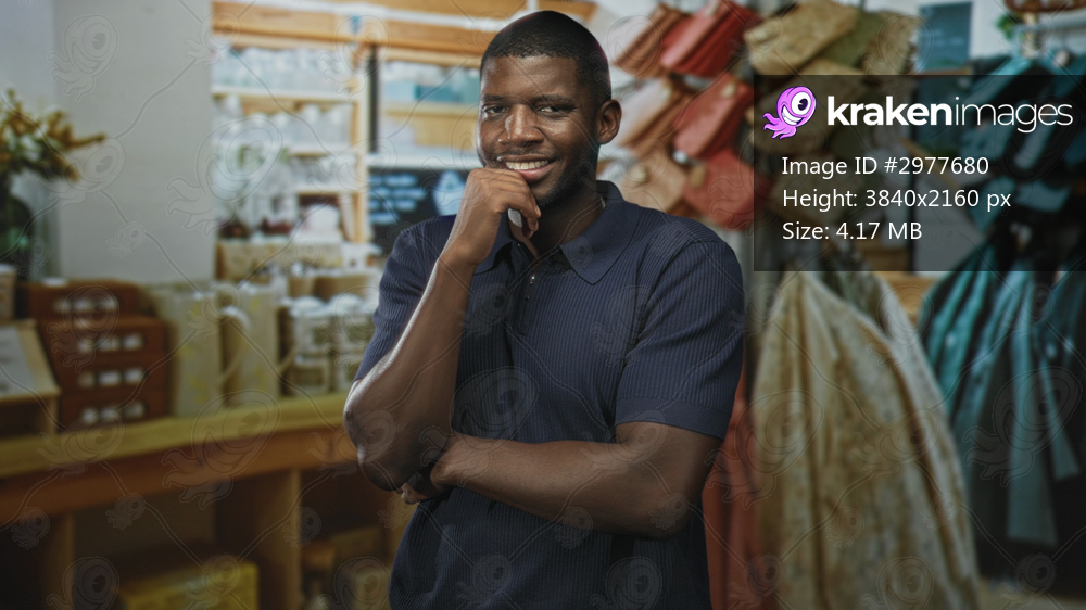 Man with hand on chin and folded arms smiling among mugs and aprons in a kitchenware store; thoughtful confidence.
