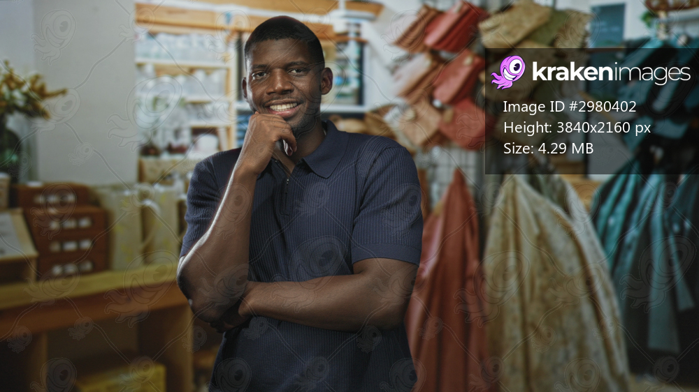Man with hand on chin and folded arms smiling among mugs and aprons in a kitchenware store; thoughtful confidence.