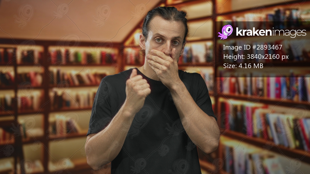 Man with hand on chin in a building library aisle among books on shelves facing camera; contemplation.
