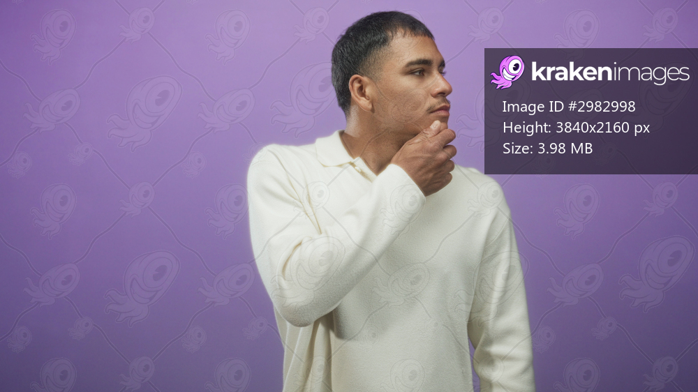 Man with hand on chin in a thinking pose in a studio with purple backdrop wearing cream sweater; thoughtful reflection.