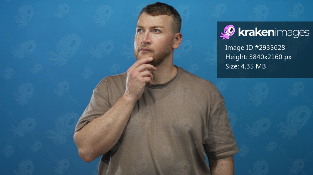 Man with hand on chin in blue studio wearing a casual tshirt, looking upward while touching chin in a pensive pose; contemplation focus.