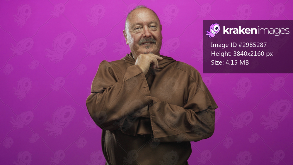 Man with hand on chin in brown monk robe, bald senior hispanic cleric, frontal portrait against magenta backdrop in studio; serenity.