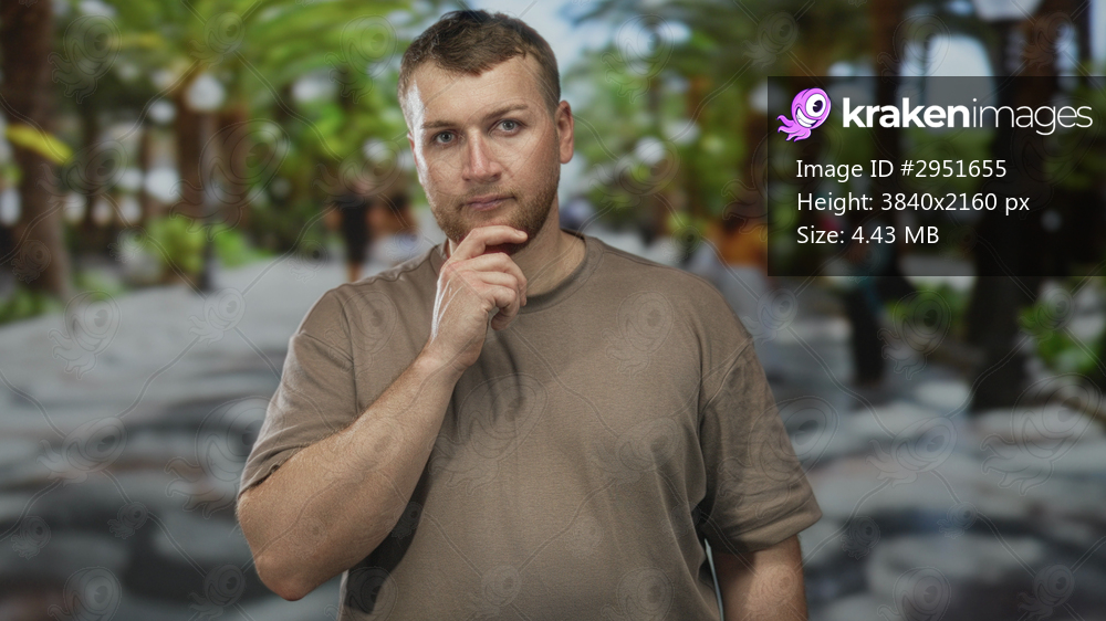 Man with hand on chin in palm tree lined street promenade, casual t shirt and beard, looking forward while standing outdoors; introspection thoughtful. - Kraken Images