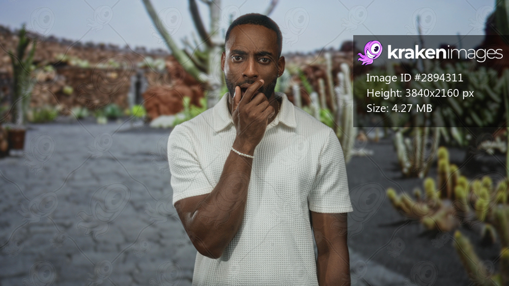 Man with hand on chin in park garden pathway wearing white shirt and bracelet; contemplation thought pondering doubt.