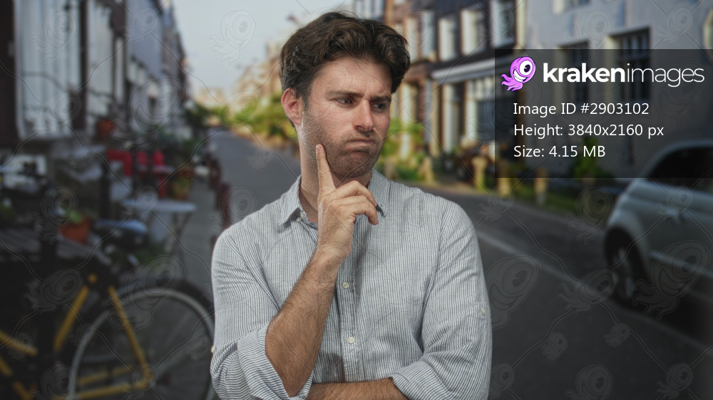 Man with hand on chin in pensive pose on a city street beside bicycle and parked car; thoughtful pondering doubt.