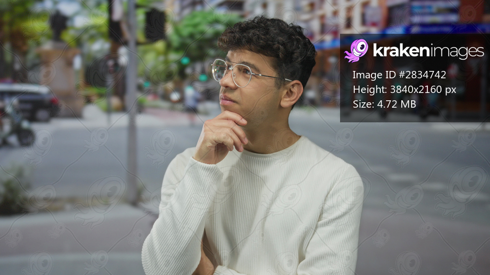 Man with hand on chin in pensive pose on urban street, wearing white sweater and glasses, looking upward toward buildings; thinking.