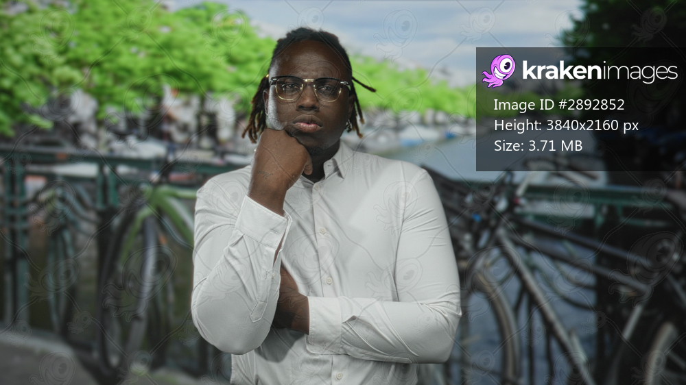 Man with hand on chin in street by amsterdam canal near parked bicycles, wearing glasses and white shirt; quiet contemplation.