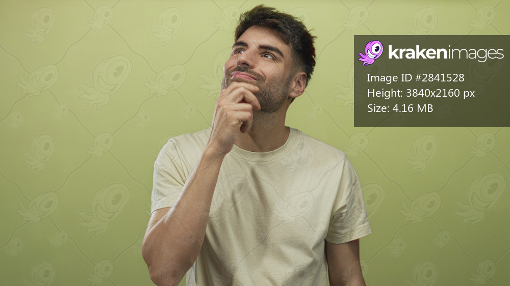 Man with hand on chin in studio wearing a light beige shirt contemplates ideas against a muted light green setting; reflection.