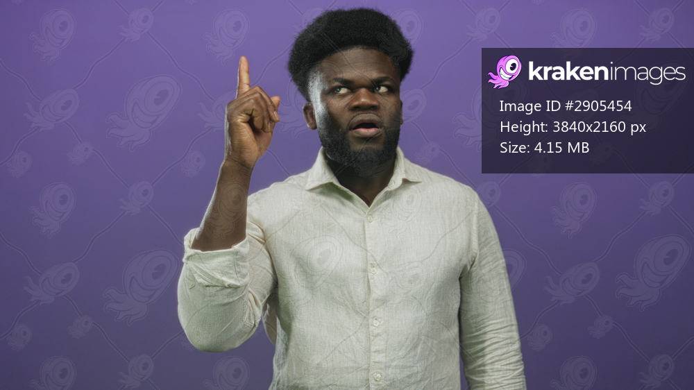 Man with hand on chin looking up and frowning in studio with purple wall and soft lighting; thoughtful reflection.