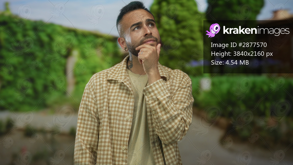Man with hand on chin looking up on street beside green hedges and pathway, wearing checked shirt and light tee; quiet contemplation.