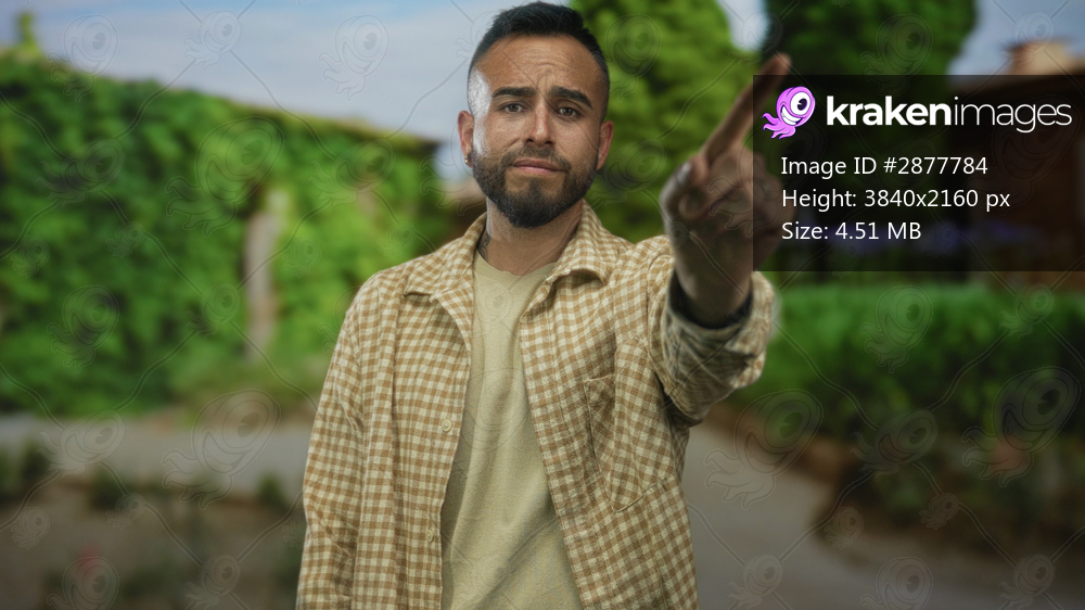 Man with hand on chin looking up on street beside green hedges and pathway, wearing checked shirt and light tee; quiet contemplation.