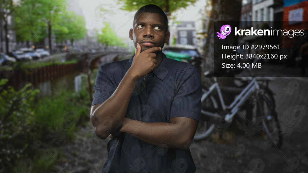Man with hand on chin near parked bicycle on street canal, arm folded in pensive pose; thoughtful reflection.
