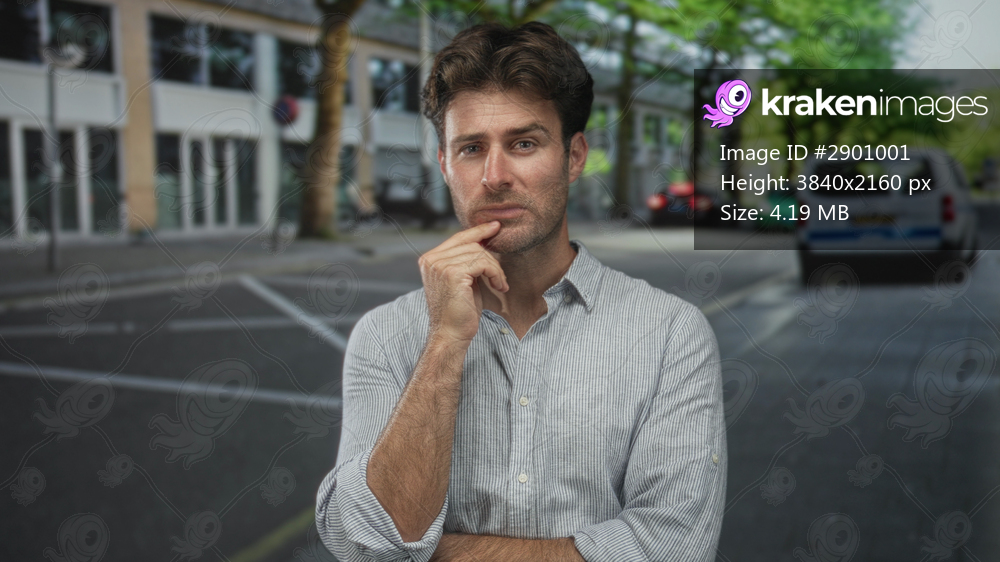Man with hand on chin on a city street, pensive pose and folded arm near parked van and urban buildings; contemplation introspection thought.