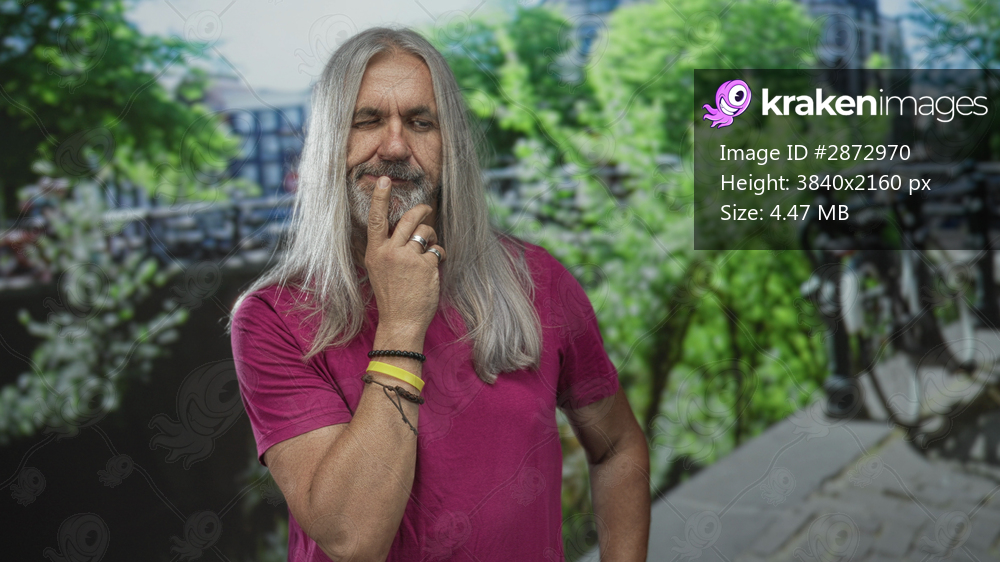 Man with hand on chin on a street by a canal with bicycles, wearing rings and bracelets; contemplative.