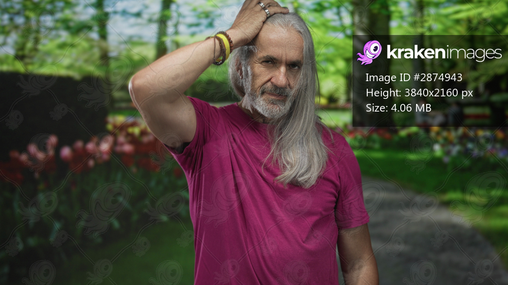 Man with hand on chin on forest path in park, long gray hair and beard, wearing magenta tshirt; contemplation thinking pondering calm.