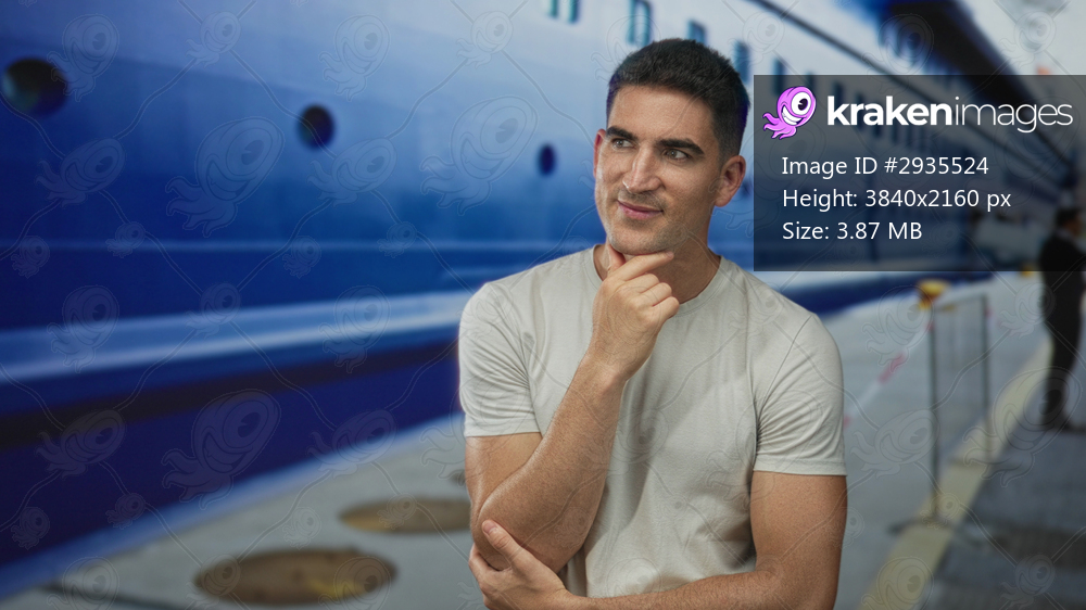 Man with hand on chin on street beside cruise ship at dock, short sleeve visible; thoughtful reflection.