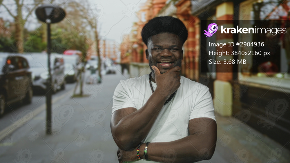 Man with hand on chin and open mouth on street near storefront, wearing white t shirt and beaded necklace; playful confidence.