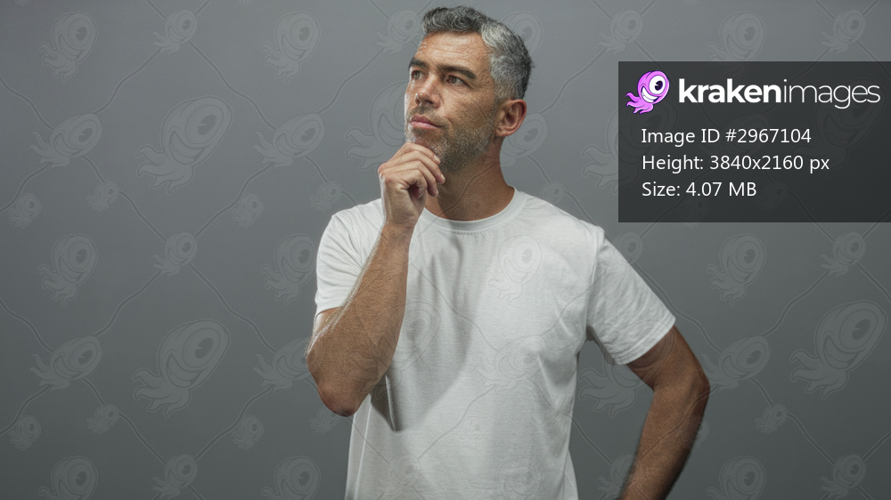 Man with hand on chin and other hand on hip thinking in a grey studio wearing a white tshirt, neutral expression; contemplation decision.