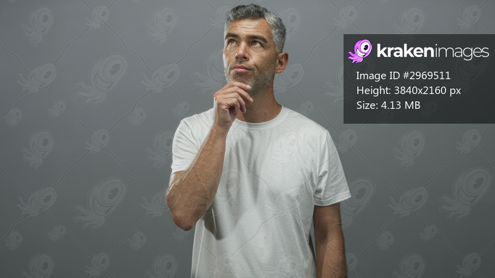 Man with hand on chin and other hand on hip thinking in a grey studio wearing a white tshirt, neutral expression; contemplation decision.