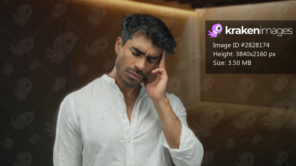 Man with hand on chin and pensive expression wearing white shirt in a minimalist brown studio space; contemplation doubt.