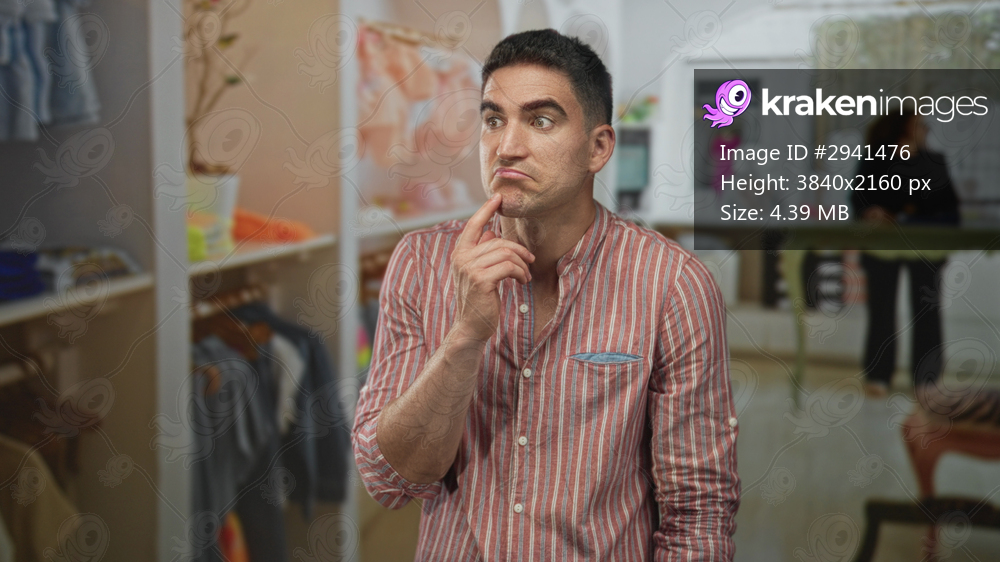 Man with hand on chin touching cheek while wearing a striped shirt in a clothing store building among racks and mirror, looking indecisive; uncertainty decision. - Kraken Images