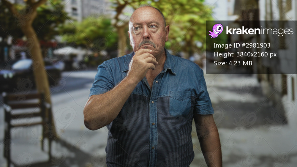 Man with hand on chin touching face on a street lined with trees and benches, wearing blue denim shirt; thoughtful concern.