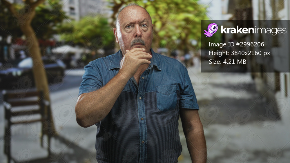 Man with hand on chin touching face on a street lined with trees and benches, wearing blue denim shirt; thoughtful concern.