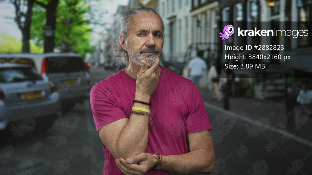 Man with hand on chin and wrist bracelets in magenta shirt standing on a street lined with parked cars and townhouses; introspection.