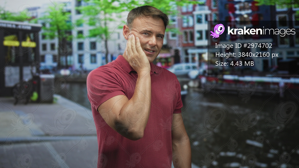 Man with hand on ear, wincing and holding ear while wearing a red polo shirt on street by canal with buildings and boat nearby; pain concern.
