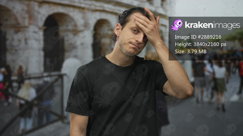 Man with hand on forehead near coliseum building on busy street, visible tired gesture and long hair; travel fatigue.