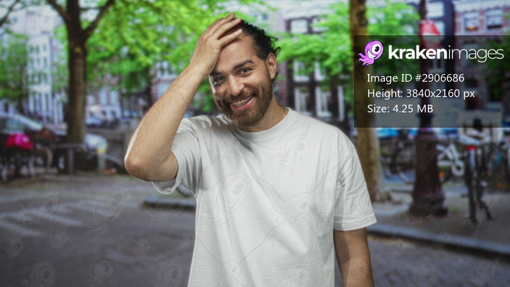 Man with hand on forehead smiling on street in city wearing white t shirt near bicycles and trees; embarrassed.