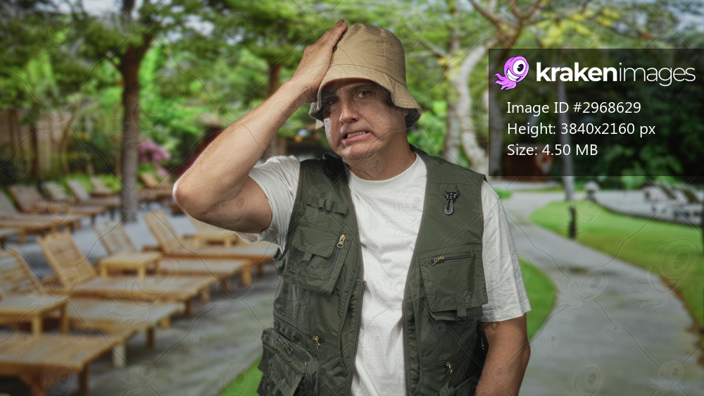 Man with hand on head holding a bucket hat, wearing olive vest and white tee, standing on a forest path by wooden loungers; tired contemplation.