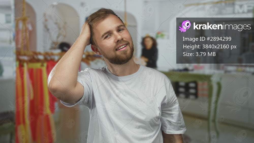 Man with hand on head and slight smile inside clothing store building amid racks; casual ease contentment.