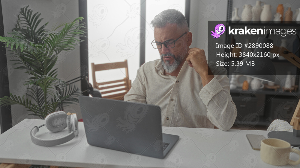Man with hand on neck at home office desk using laptop and lamp, showing neck pain; discomfort work.