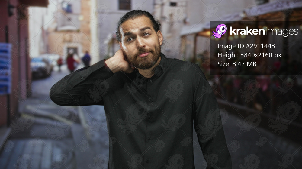 Man with hand on neck and beard looking up on a cobbled street by an outdoor restaurant terrace with blurred diners; pensive doubt.