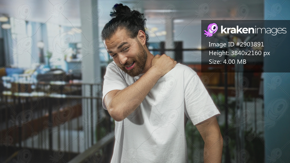 Man with hand on neck holding shoulder in pain inside hotel building by railing; discomfort recovery fatigue.