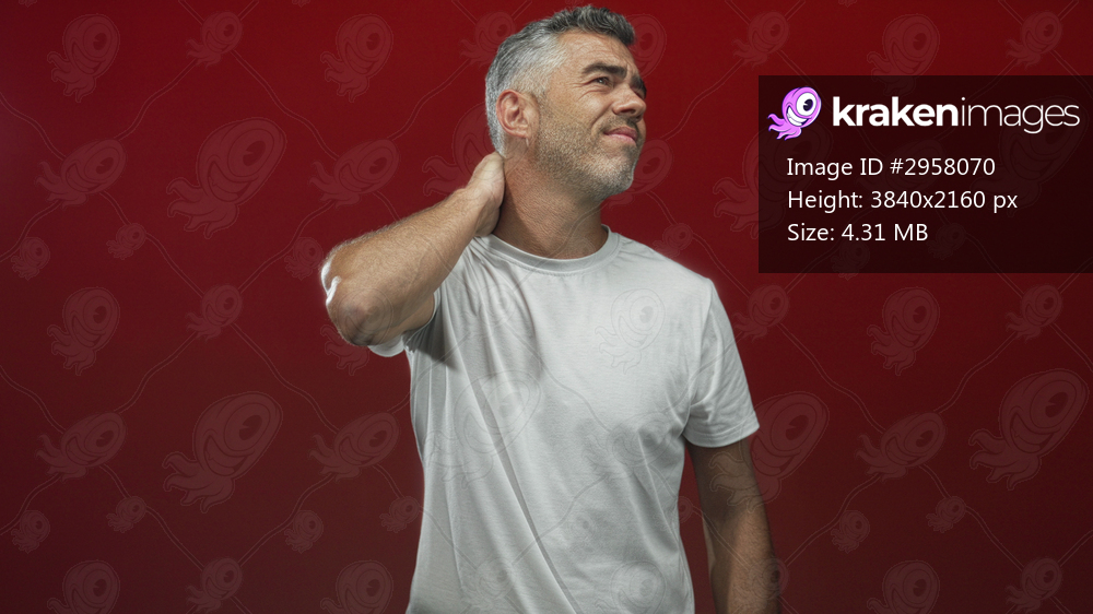 Man with hand on neck touching neck and wincing in studio with red backdrop wearing white tshirt, showing neck discomfort and mild strain; discomfort recovery. - Kraken Images