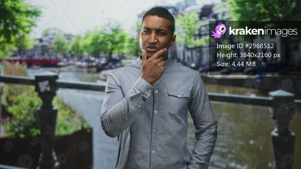 Man with hand on temple by canal bridge railing on a street, touching his face in visible pain while wearing a buttondown shirt; discomfort.