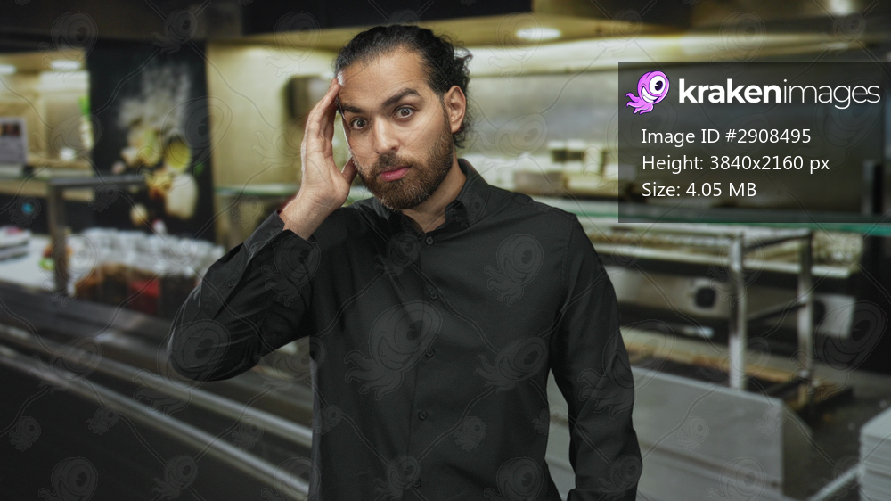 Man with hand on temple in kitchen building wearing black shirt and beard, looking puzzled and tired; stress overtime shift.