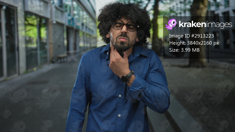 Man with hand on throat near trees and modern building on city street with throatache;discomfort health concern urgent.