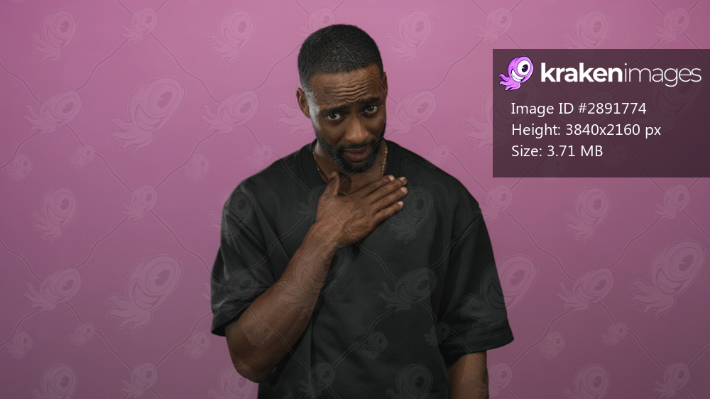 Man with hand over chest in pink studio showing chest touch gesture and pensive expression; regret sincerity.